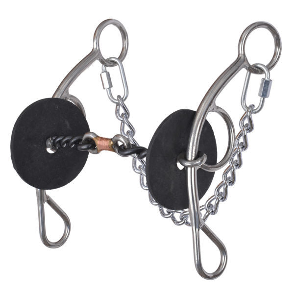 This is a great choice for horses that need help picking up their shoulders. This shorter shank bit gives a moderate amount of “Whoa”. This 3-piece twisted wire mouth with the copper dogbone keeps the horse’s attention without being too severe.