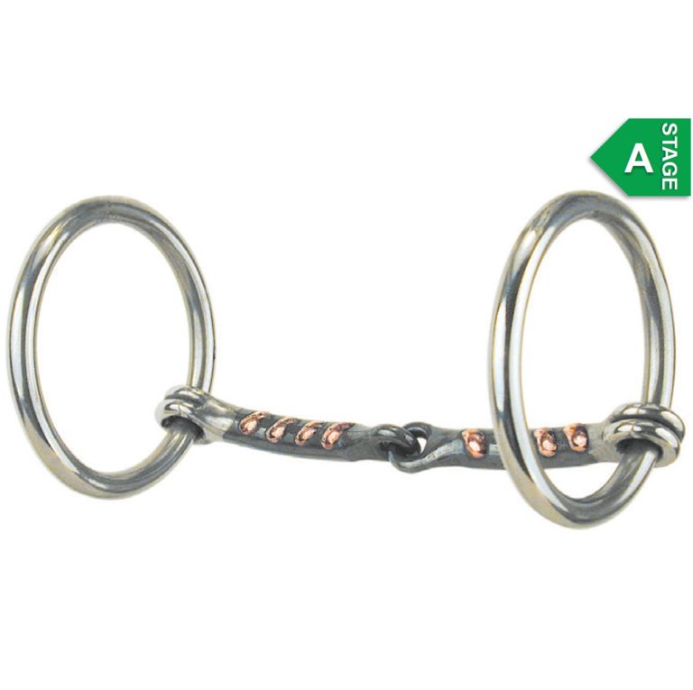 One of the best schooling bits, this is a great tool when used with the intent to lighten up the horse’s head and back him off the bit, then return to his normal bit after the desired result is achieved. Inlaid scrub board copper causes the horse’s mouth to salivate to keep it soft and supple. Mullen relief is used on all our snaffle mouthpieces which is a forward curve that creates even pressure across the bars and tongue to eliminate the nutcracker effect.