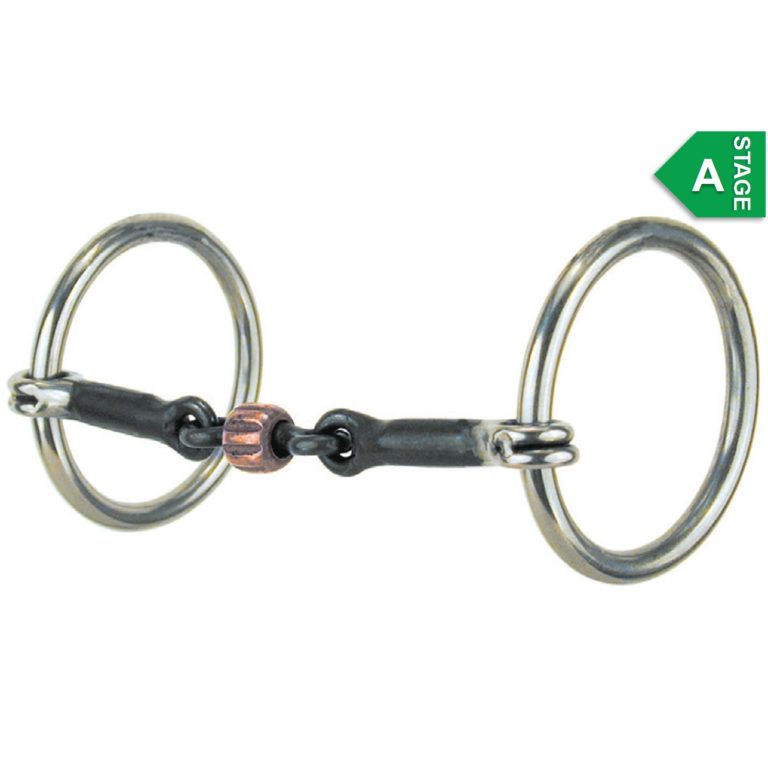 Traditional rings with more weight for better feel. Mouthpiece breaks over the bars at a different angle to contact new nerves with some tongue pressure for better control. Mullen relief mouthpiece creates even pressure across the bars and tongue to eliminate the nutcracker effect. Copper roller adds moisture and acts as a pacifier.