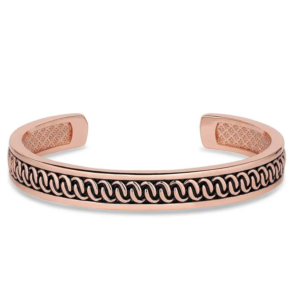 The Boynton Canyon Copper Cuff Bracelet is made to represent the red rocks of the West. The copper pattern in the center of the cuff gives the impression that the two lines of metal are interlocking with each other and are repeated throughout the entirety of the cuff. The center design is surrounded by a smooth copper edge creating a finished look. One size fits most.