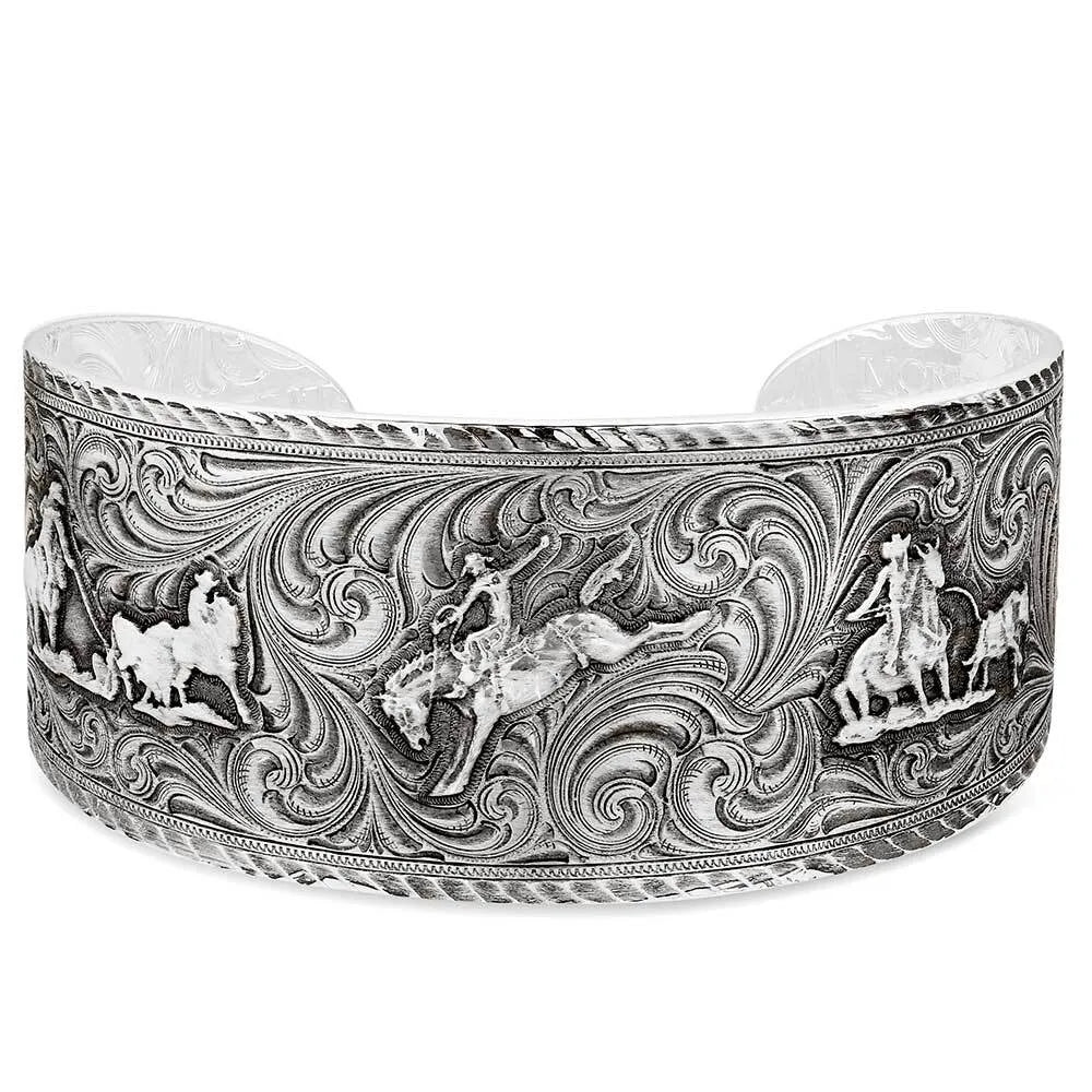 Make every moment picture perfect with the Picture Perfect Cuff Bracelet. This unique bracelet features silhouettes of several of Montana Silversmiths classic figures, such as the saddle bronc and barrel racer figure. These images were drawn directly into the design along with the gorgeous filigree displaying the heart of the rodeo. The antiqued silver tone of the bracelet gives the whole piece a vintage feel. One size fits most.