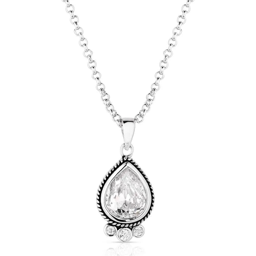 Light up the room with the Angel Joy Necklace. A large cubic zirconia teardrop shaped stone is the main focal point, framed by a roped edge with black paint. Three smaller crystals are attached below for added detail. The silver toned bail is hanging from a 22 inch adjustable chain.