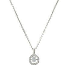 A petite open circle shaped necklace has an outer frame in a bright silver tone set with bright clear stones, like a shining halo. A center brilliant round clear stone is held by a slender arm on either side holding it in place. The delicate pendant rests on a princess length 19 inch chain.