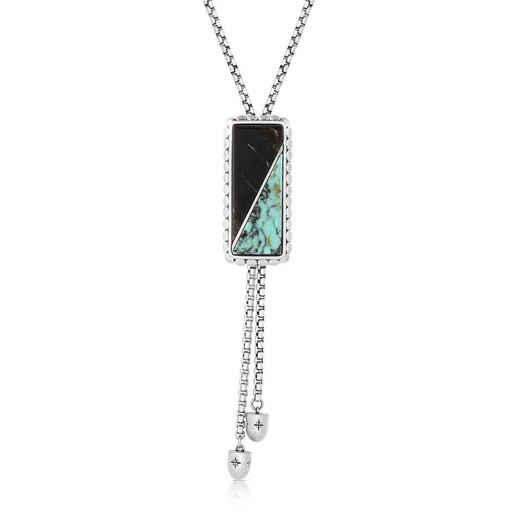 Stand out from the crowd with the Double Essence Bolo Necklace. This necklace features a rectangular pendant. The design of the pendant is half onyx and half turquoise creating a unique design. A silver tone border surrounds the pendant. This bolo necklace has a 32 inch box chain. The pendant moves creating full versatility in the length allowing the necklace to be worn in a variety of ways.