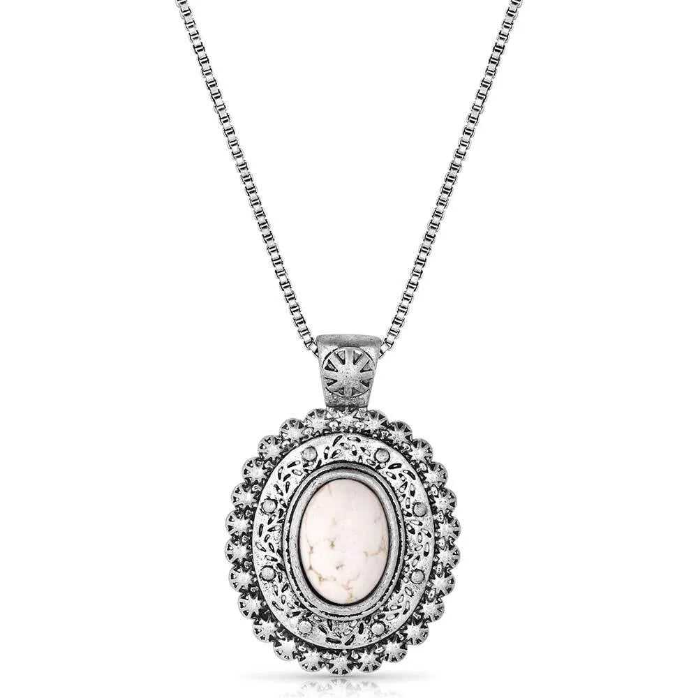 Carry your own piece of heaven with the Heaven's Halo Necklace. This necklace features a White Buffalo stone encircled by a silver tone. The pendant has intricate etching and an antiquing that brings out the design. This necklace has a 21 inch box chain. Stone color will vary.