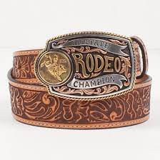 Boys' floral tooled leather 1 1/4" brown belt features a removable All state Rodeo Champion belt buckle. Made in the USA!