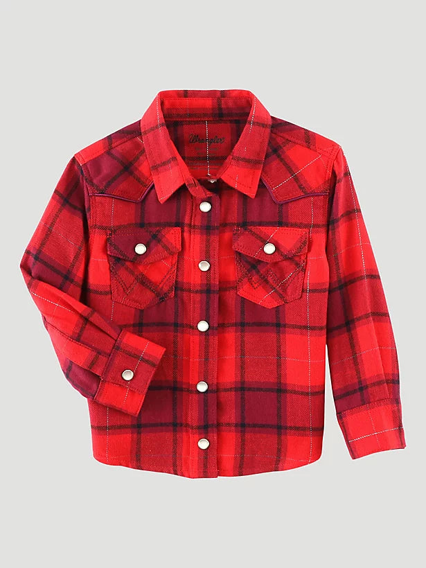 For a cowgirl in training, her first snap shirt matters. Make it count with the Wrangler® Plaid Flannel Western Snap Shirt. It comes with classic detailing from the pearled buttons to the pointed yoke, and is finished in a rosy red flannel that's perfect for holiday pictures. Made from a soft cotton blend, it'll keep her cozy all season long.