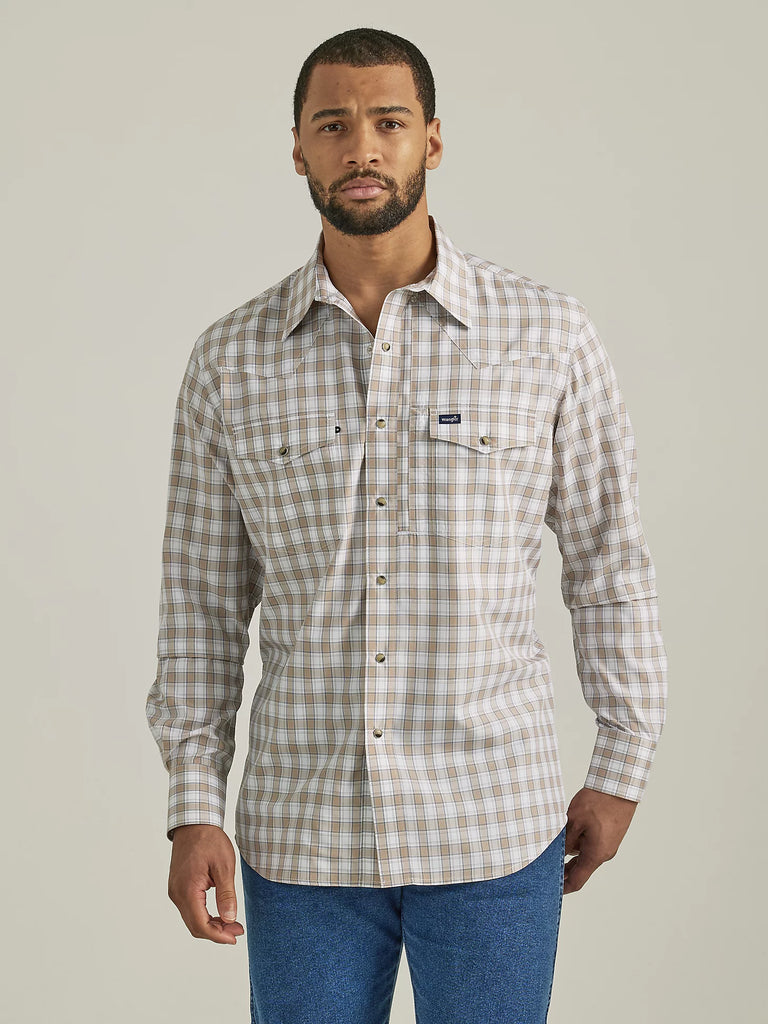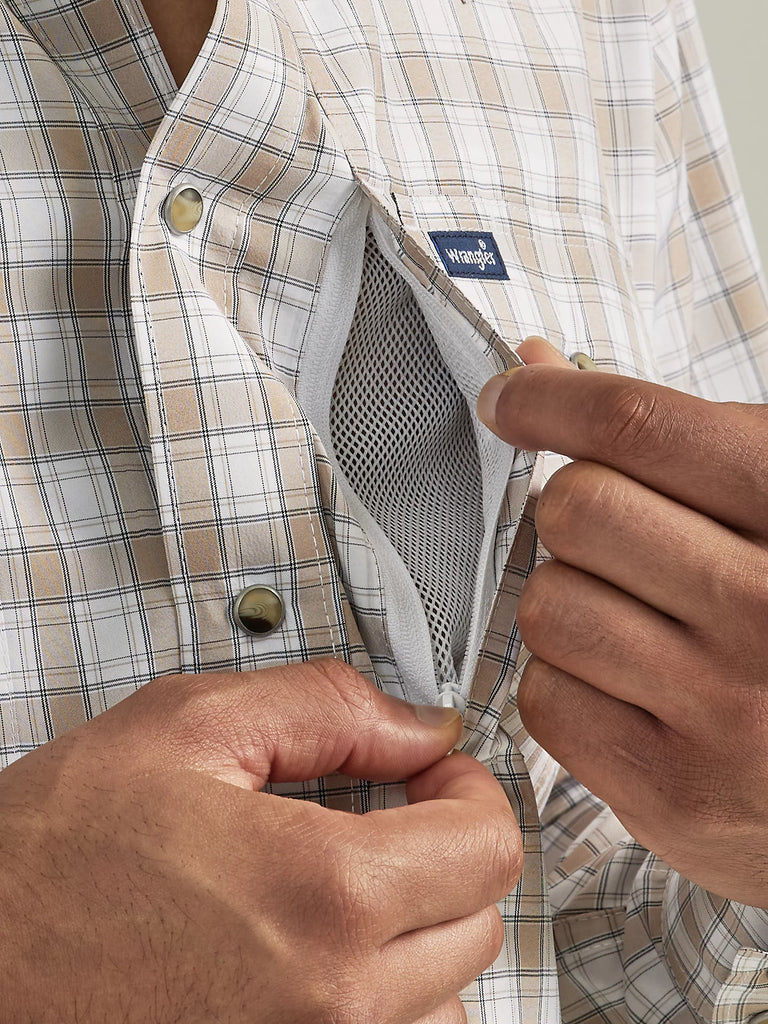 All the western styling you love and want with the performance features you need. This long-sleeve plaid snap shirt comes fully equipped with UV protection and a moisture-wicking finish to keep you protected from the elements. This classic fit shirt comes with pointed yokes and a full snap closure as well as a hidden snap-down collar to keep you looking polished and ready for whatever the day brings. A hidden back vent makes this shirt even more breathable and built-in sleeve keepers make it easy to adjust your look on the fly. Between the two chest pockets and zippered Napoleon-style pocket on the left, you’ll have plenty of storage space for your essentials. Plus, it comes with a glasses cleaner at the hem to keep you smudge-free. Wear it with your favorite pair of Wrangler Retro® or 20X® jeans to complete the outfit