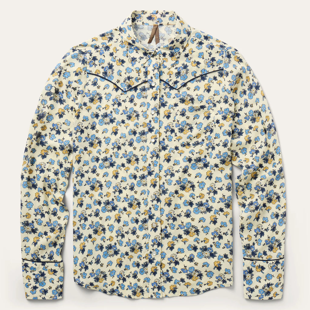 This long-sleeve shirt features our exclusive Field Flowers print. It’s crafted from high-quality 100% rayon, which has a smooth, silky feel and an easy drape. Its western-inspired style details include single point deep curved front and back yokes, a single left chest patch pocket, a full snap front and navy blue piping at its yokes and cuffs.