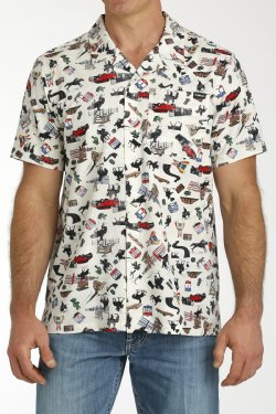 Cowboy in style and keep comfortable on the go wearing a rodeo themed camp shirt like this one crafted by CINCH. Our white printed poly-spandex shirt featuring white marble buttons is the lightweight option you need for warm summer months on the circuit.