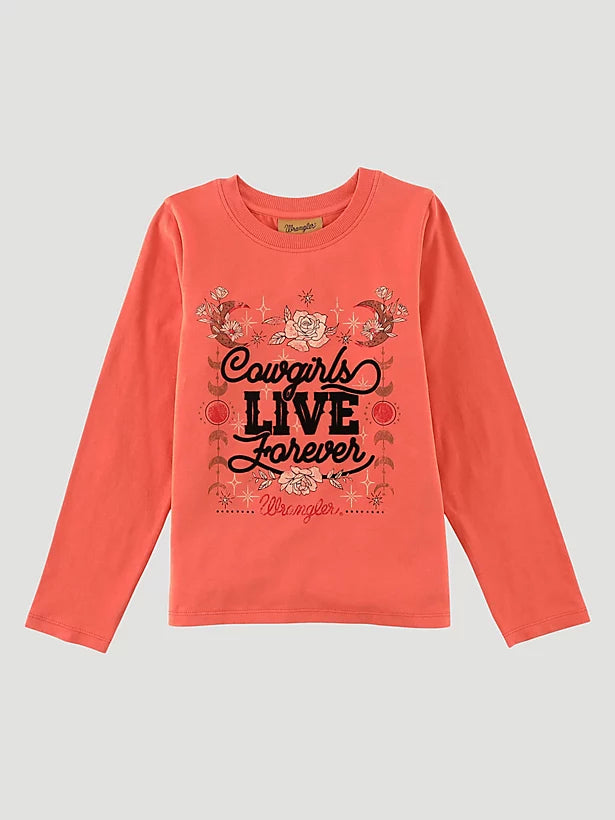 The Wrangler® Girl's Long Sleeve Cowgirls Graphic Tee is a perfect way for her to make a stylish statement when the temperature dips. The "cowgirls live forever" graphic is ready to let everyone know she lives the western lifestyle, and the soft premium cotton will see to it that she stays comfy all day.
